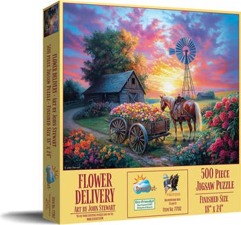 Embark on a serene journey with the Flower Delivery 500 Piece Jigsaw Puzzle by SunsOut, designed for adult puzzle enthusiasts and beautifully illustrating John Stewart's enchanting artwork of a picturesque countryside scene where rustic charm meets vibrant florals. Crafted from high-quality recycled cardboard, this puzzle offers perfect precision and durability, with interlocking pieces that click effortlessly into place for a smoother experience. Once completed, it showcases a stunning size of 20" x 27". Commitment to sustainability is at the heart of SunsOut’s production, using soy-based inks and eco-friendly materials that allow you to revel in nature's beauty while being kind to the planet. Made in the USA by a woman-owned small business, this puzzle emphasizes American craftsmanship, with each piece reflecting a dedication to quality and artistry. Enjoy peace of mind with SunsOut’s worry-free guarantee, ensuring that any missing or damaged pieces are swiftly handled by their devoted customer service. The Flower Delivery puzzle is more than just a pastime; it’s an immersive celebration of art, environmental responsibility, and exceptional craftsmanship that challenges your mind and soothes your soul.