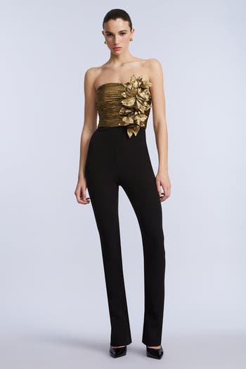 Metallic lamé strapless jumpsuit with a pleated bodice and sculpted floral appliqué. Designed with slim black legs for a sleek, elongated look. A concealed back zipper keeps the silhouette sharp—perfect for holiday parties.