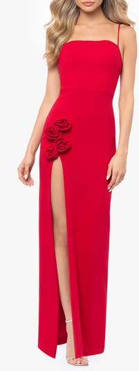 Dimensional floral embellishments highlight the thigh-high slit of this event-ready crepe dress.