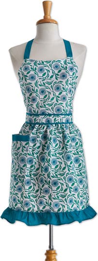 add a touch of vintage charm to your kitchen with the flower grove vintage apron. hand screen printed on blue cotton, this apron features a beautiful floral design with a vintage feel. complete with adjustable neck and waist ties for comfort, and a single pocket with a ruffled trim for a touch of whimsy.