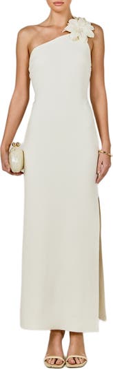 Enchanting beaded blooms enhance the charm and texture of this shoulder-showing maxi made with a leg-baring side slit.
