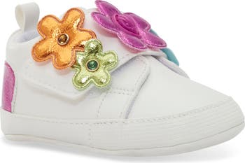 A soft leather sole grounds this floral appliqué sneaker done in signature metallic rainbow hues and fixed with an adjustable strap to give baby a secure fit.