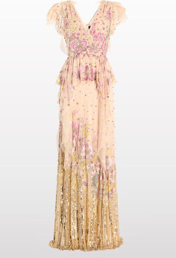Introducing flower power blending romantic charm with intricate embellishment. The fitted bodice features a deep V neckline and delicate, softly gathered shoulder details that add a touch of ethereal elegance. Embroidered florals and sequins cascade across the design, leading into a fluid skirt that shimmers with every step. Sheer overlay panels create graceful movement, making this gown perfect for occasions that call for a statement of timeless beauty.