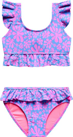 An exuberant floral jacquard brings color and texture to this adorable ruffled two-piece swimsuit perfect for beach days.