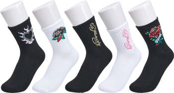 A set of mid crew socks featuring tattoo-inspired artwork. Each pair showcases bold graphic motifs such as flaming hearts, roses, scroll-style lettering, and classic tattoo-style illustrations. The socks include ribbed cuffs for a secure, comfortable fit, with each design adding a unique, edgy, streetwear-influenced look to the set.