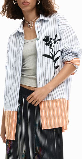 Contrasting stripes and an elegant floral motif make this woven shirt an elevated, modern version of a weekday classic.