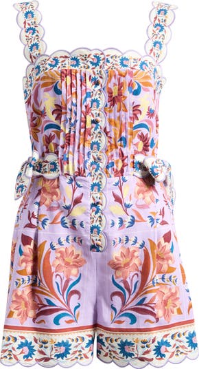A signature vibrant print enhances the vacation-perfect vibes of this crisp linen-blend romper made with scalloped trim and crisp pintucks.