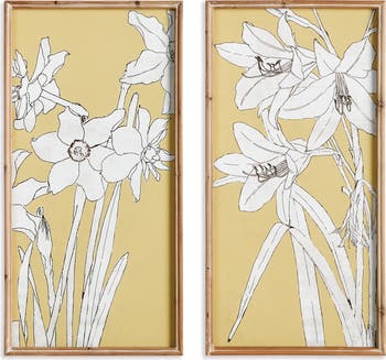 - The muted yellow background of these flowering amaryllis prints is a clever nod to the signature Aurora amaryllis. A modern take on a traditional botanical composition. This well scaled diptych is finished off with whitewashed wood frames. Interior use only. Dust with dry cloth. 15.75 x .75 x 31.5 15.75 x .75 x 31.5