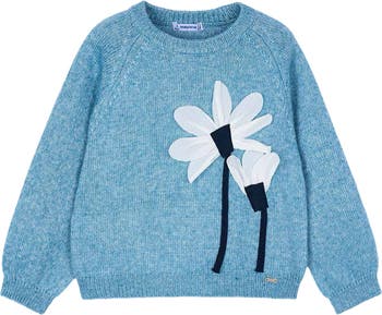 Girl Flowers Applique Knit Jumper contains recycled polyester. Puffed sleeved Sweater for girls. Round neckline. Knitted fabric, soft and pleasant to the touch. Decorative elements: floral appliques.