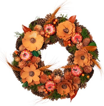 This glorious fall wreath is bursting with all the vibrant colors and exciting textures of the season, making it an absolute must-have piece of fall decor. Forget muted tones—this beauty is packed with brilliant orange accents and deep brown shades, featuring a lively mix of faux pumpkins, eye-catching flowers, and gorgeous, plentiful foliage that will make your door the envy of the neighborhood. The , full design provides an instant, spectacular splash of seasonal cheer for fabulous autumn decor. This autumn wreath is expertly crafted to capture the essence of the season's abundance in one striking circular piece. It’s the easiest, most striking way to give your entryway a seasonal facelift and show off your love for all things cozy and crisp. Simply hang it up and watch your home transform! Because this impressive piece is unlit, it blends seamlessly with any setting and offers you the freedom to customize the illumination with your own decorative string lights if you wish. Go ahead, make a statement—this fall wreath is simply unbe-leaf-able and guaranteed to give your space that warm, inviting feeling. Adding this to your autumn decor collection is a no-brainer! Product Features: Unlit Multi-sized pinecones with dried wheat and thistle seed pods Adorned with berries, gourds, greenery, and orange wood-shaved florals No assembly required – wreath comes in 1 piece Flat foam frame backing for hanging Recommended for indoor use - if using outdoors, place under a covered area Dimensions: 13.25" diameter (measured from outermost tip/edge to outermost tip/edge across the wreath) Material(s): pinecones/dried foliage/foam/plastic/wood