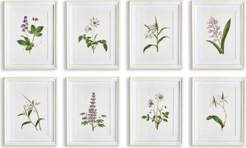 - This sweet selection of 8 botanicals in lavender hues is a charming set. Hang together or break up for smaller vignettes. With a simple white wood frame and crisp mat, it makes a nice accent for bedroom or powder room.