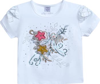 The Flowers Applique T-Shirt is a delightful addition to everyone's wardrobe. This soft cotton t-shirt features a charming flower and gem applique, adding a touch of sparkle and whimsy. The round neck ensures a comfortable and classic fit, while the short puff shoulders bring a playful flair. The straight hem offers a neat and simple finish, making this t-shirt versatile and easy to pair with various outfits.
