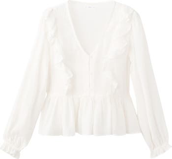 Wax poetic in this romantic blousy top trimmed with floaty ruffles for fluttering movement.