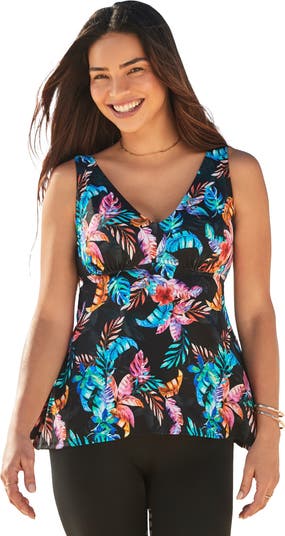 A flattering A-line silhouette on this tankini top lends it a swingy, fun and flowy fit to wear poolisde or for a day by the water. Built-in shelf bra. Adjustable straps.