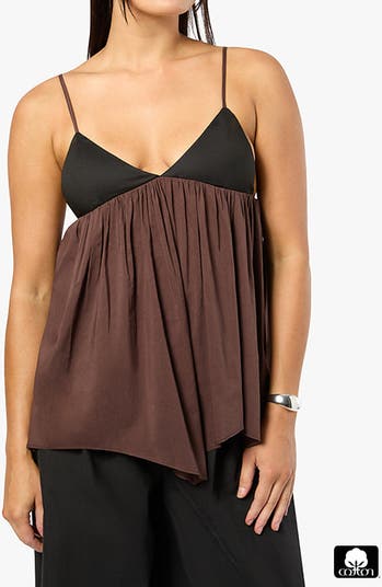- Made from lightweight cotton voile, this cami features triangle cups with adjustable straps and a handkerchief hem. The fabric is lightly gathered below the bust with stretch along the back to enhance its floaty shape. Flared fit Gathering at underbust Encased elastic at back Adjustable straps with sliders and O-ring Handkerchief hem Triangle shaped cups 94% Cotton 6% Spandex Dry clean only.