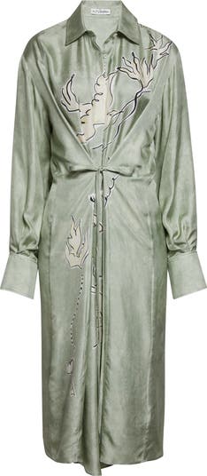 Joseph Altuzarra transforms surrealist imagery into wearable art with this silk shirtdress, where a painterly bird motif fans out across the silhouette that can be cinched with a matching waist tie.