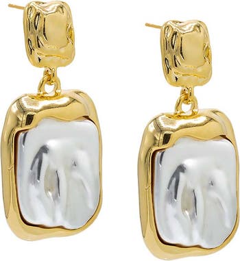 Give your pearly poise a modern makeover in Adina Eden's Fluid Gold & Pearl Drop Stud Earring, featuring a stunning XL square drop pearl pendant set into a delicate 14K gold-plated square stud. Without a doubt, this gem is a conversation starter with its sleek design and alluring vibes. Pair it with accent studs and a flowy dress for an elegant yet slightly edge style.