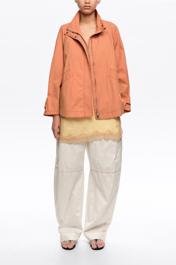 Short A-line trench in technical fabric. Features a concealed front metal zip, high neck, long shaped sleeves with press-stud tab cuffs, piped pockets, logo print, and a maxi back yoke.