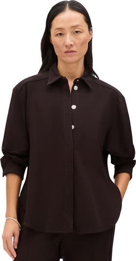 Designed for a relaxed fit, this blouse features an exaggerated curved hem and graphic stitching details throughout. Finished with self covered snap closures. This viscose is crafted using wood pulp from FSC-Certified producers committed to the protection of ancient and endangered forests.