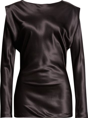 Designed to play with light as it cuts a striking silhouette, this silk-satin top is tailored broad through the shoulders and then languidly tapers through the sleeves and elongated torso.