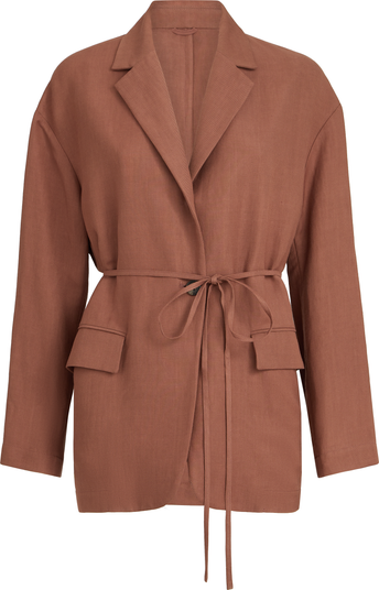 - Horn button closureNotched lapelHand pockets with flapSingle back ventDetachable tie beltNickel-free monili decoration