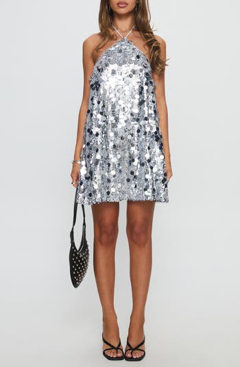 Lustrous sequins and paillettes saunter down this fabulous, party-ready minidress topped with an adjustable halter neckline for a perfect fit.