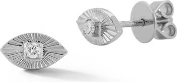 A single round diamond radiates shine from the center of these fluted evil eye stud earrings set in icy 14-karat white gold.