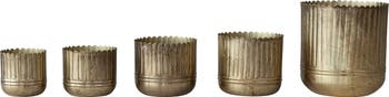 This set of 5 Antique Gold Metal Fluted Planters with scalloped rims is a perfect addition to any home decor. Made of durable metal, each planter features a unique fluted design and an elegant scalloped rim, finished in a sophisticated antique gold. The set includes planters of varying sizes: 9.5 inches in diameter by 10.5 inches in height, 7.5 inches in diameter by 6.75 inches in height, 7.5 inches in diameter by 6.25 inches in height, 6.25 inches in diameter by 5.5 inches in height, and 5 inches in diameter by 5 inches in height. Ideal for vintage, French country, and industrial styles, these planters bring a timeless elegance to any space. Whether used indoors or outdoors, these planters will add a touch of sophistication to any home. The antique gold finish complements a variety of color schemes and adds a luxurious feel to any room.
