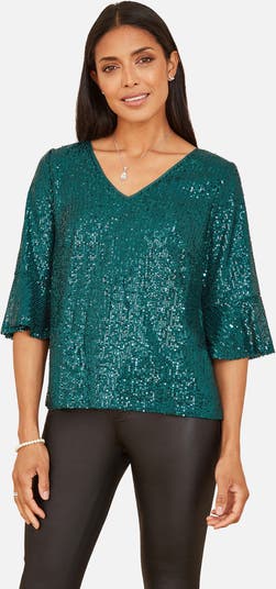Out out has never felt so good! This stunning Yumi Sequin Relaxed Fit Top is super stylish and perfect for parties. With all-over sequin detailing, this relaxed fit top is fully lined, fusing comfort with style. Features super flattering fluted sleeves and a peep hole back fastening. Match with skinny jeans or leather trousers to complete the look.