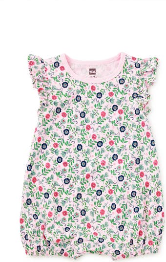 Sweet details meet everyday ease. This flutter-sleeve romper features an artist-designed floral print that adds charm to a one-and-done outfit made for tiny adventures. Thoughtfully designed for comfort and convenience, it's crafted from soft 100% cotton jersey with snaps at the inseam for easy diaper changes and elastic leg openings for a gentle, flexible fit. Made to be worn often, washed well, and passed along when the time comes. Perfect on its own or as part of a coordinated look with matching styles for siblings.