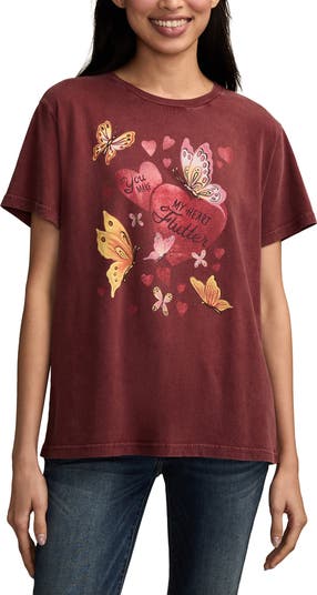 Bring a bit of whimsy into your day with this playful cotton T-shirt featuring fluttering butterflies and charming heart graphics.