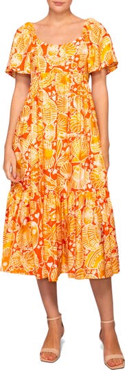 A vibrant seashell print adds to the vacation-ready vibes of a billowy tiered dress with fluttery sleeves and a smocked panel at the back.