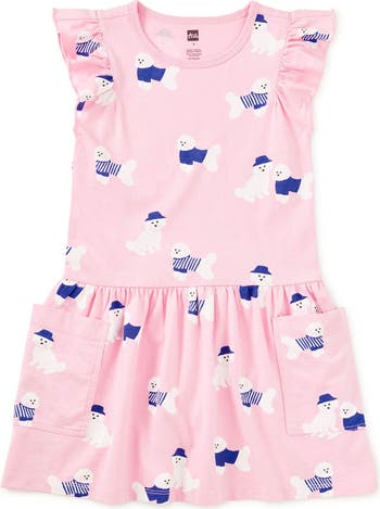 A cheerful favorite designed for everyday play. This Flutter Sleeve Pocket Dress features an artist-drawn Spanish Water Dog print, created in-house to bring a joyful, character-filled feel to everyday dressing. Thoughtfully made for comfort and movement, it's designed to be worn often, washed well, and loved long enough to pass along. Crafted of soft 100% cotton jersey, it features flutter sleeves, a gently gathered skirt, and side patch pockets for collecting small treasures. Pair with leggings or Somersault Shorts for easy, all-day versatility.