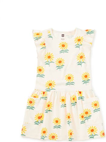 A cheerful favorite designed for everyday play. This Flutter Sleeve Pocket Dress features an artist-painted sunflower print, created in-house to bring a bright, happy feel to a classic silhouette. Thoughtfully made for comfort and movement, it's designed to be worn often, washed well, and loved long enough to pass along. Crafted of soft 100% cotton jersey, it features flutter sleeves, a gently gathered skirt, and side patch pockets for collecting small treasures. Pair with leggings or Somersault Shorts for easy, all-day versatility.