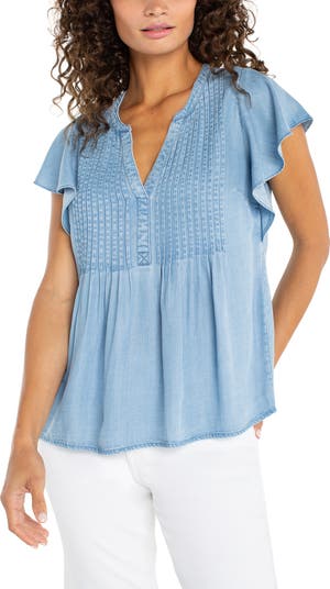 Frilled sleeves add fluttering movement to this lightweight chambray top textured with a pintucked yoke.
