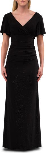 Rhinestone embellished jersey dress with a V neckline and faux wrap front. The flutter sleeves make this dress comfortable to wear. Back zipper closure.