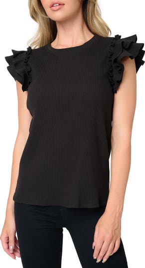 Soft ruffles flutter at the sleeves of this stretch-cotton top crafted with allover ribbing.