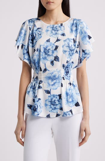 Play up your silhouette in this smocked-waist peplum top that combines structure and flow.