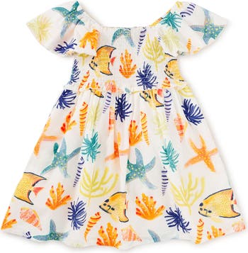 Tea Collection Flutter Sleeve Smocked Dress, Main, color, Watercolor Sea Life