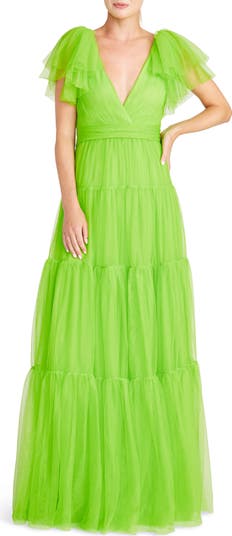 Make a splash in a flash of green wearing a tiered tulle gown designed with frothy sleeves and a swishy skirt.