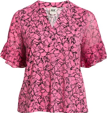 Frill-trimmed sleeves add charm and fluttering movement to this soft stretch-kissed top romanced by delightful blooms.