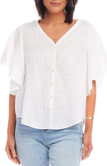 Fluttery sleeves add dynamic movement to this effortlessly sophisticated button-front shirt made from lightweight linen.
