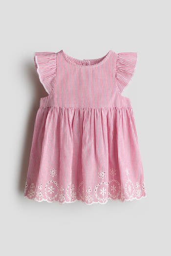 Dress in a soft cotton weave detailed with broderie anglaise. Round neckline, opening with buttons at the back, flutter sleeves, gathers at the waist and a flared skirt with a scalloped hem. Unlined.