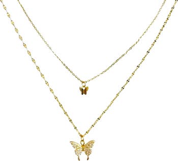 Introducing our Fluttering Elegance: Gold Butterfly Two Layer Necklace: a stunning piece adorned with butterfly pendants encrusted in cubic zirconia. This necklace exudes elegance and charm, perfect for any occasion. Elevate your style effortlessly with its versatile design and captivating sparkle.