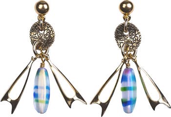 Indulge in the exquisite allure of the Flwr Chyld Earrings, where vintage elegance meets contemporary design. These stunning handcrafted accessories are adorned with textured abstract gold coins that beautifully complement the shimmering bezel-cut frosted fiesta glass dangles. Radiating sophistication, each movement catches the light, creating a mesmerizing effect. Perfect for those who appreciate a playful fusion of color, the vibrant striped glass beads offer a delightful contrast, making these earrings a versatile addition to any jewelry collection. Meticulously crafted with luxurious 18K gold-plated hardware, these lightweight earrings measure approximately 2.5 inches in length, ensuring all-day comfort and wearability. Whether you're enhancing a casual outfit or adding a touch of elegance to evening attire, these handmade earrings effortlessly elevate your style.