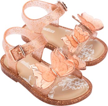 Pretty butterflies sit at the toe of a little sweet sandal featuring an easily adjustable buckle strap and the brand's signature fruit-scented PVC upper.