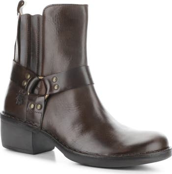 A stacked heel and decorative harness give Western-inspired vibes to this leather bootie.