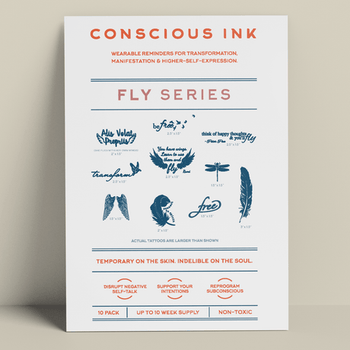 Our Fly Variety 10-Pack provides you with that extra lift, encouraging and inspiring you to spread your wings and soar. Prepare for take-off! (Contains 10 different Manifestation Temporary Tattoos. Individually cut. Ready to apply in seconds!)