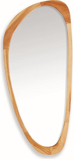 - This well scaled mirror is framed with a teak wood. A beautiful grain with a smooth, honed finish. With it's unique elongated shape, it is a contemporary casual accent made for powder room, entry hallway or study. Designed with a keyhole for hanging.