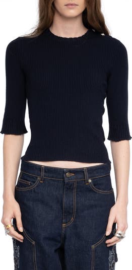 Square rhinestone buttons trim the shoulders of this cropped sweater updated with allover ribbing and framed by elbow-length sleeves.